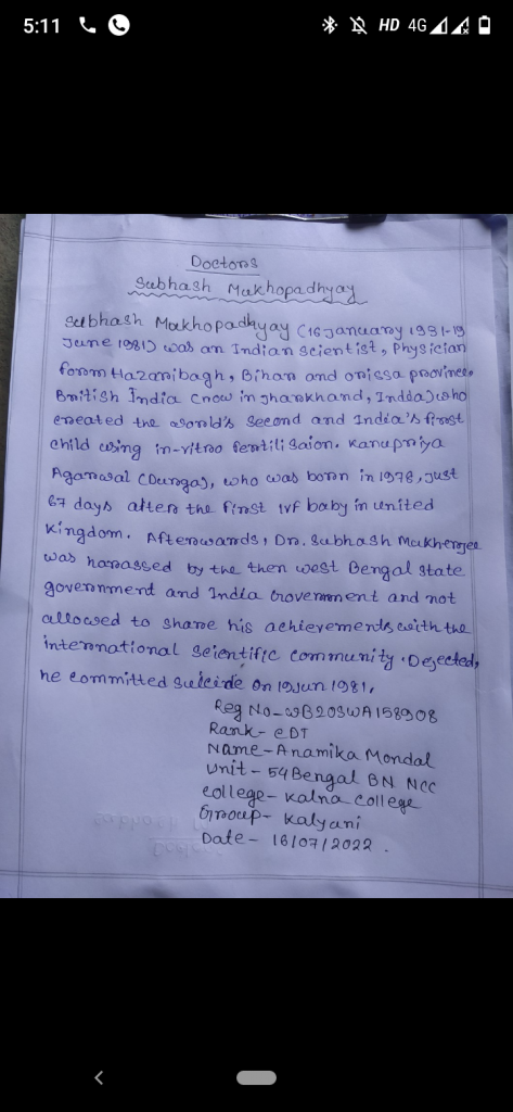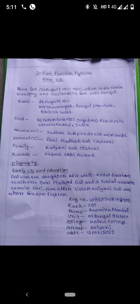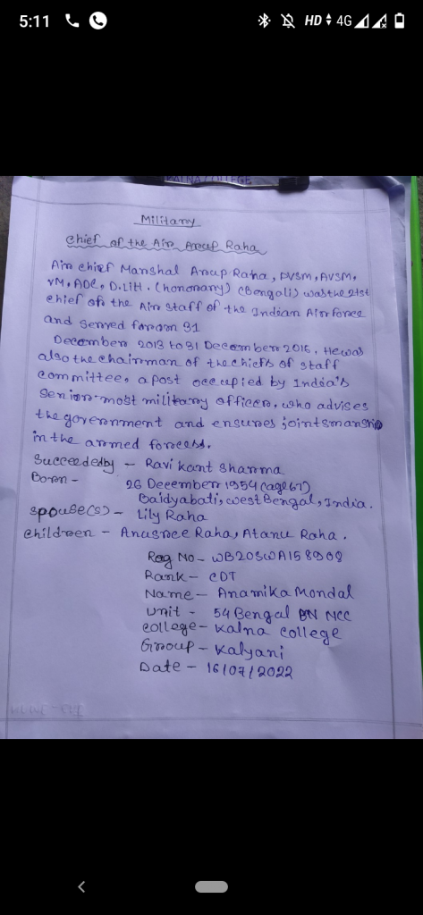 Name- Cadet Piu Das Regiment no-WB21SWA153319 6 Bengal Battalion Chakdaha college
