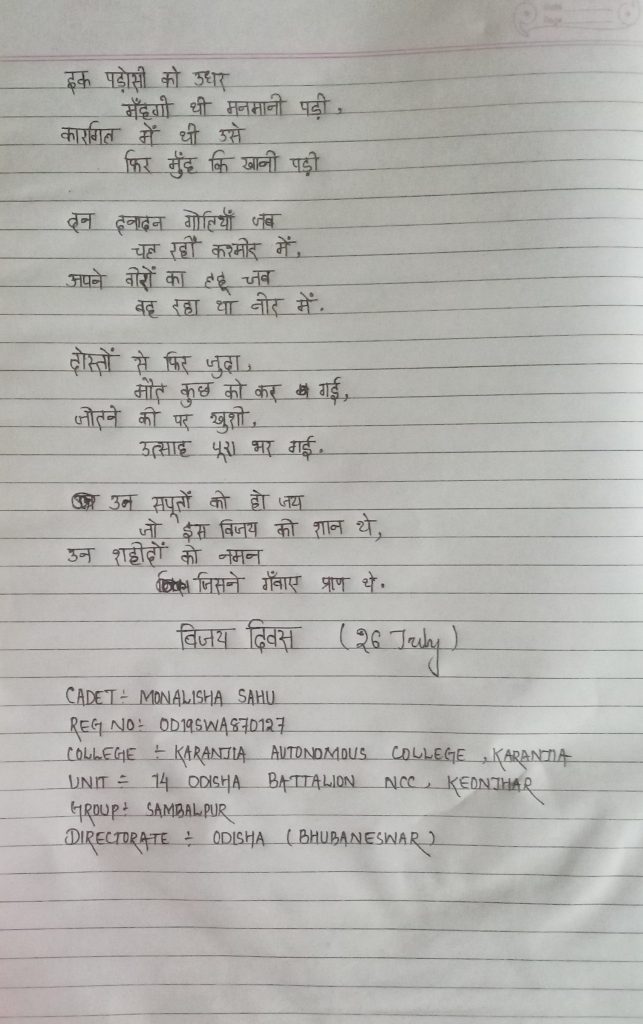 NAME:-CADET MONALISHA SAHU REG NO:-OD19SWA870127 COLLEGE:-KARANJIA AUTONOMOUS COLLEGE, KARANJIA UNIT:-14 ODISHA BATTALION NCC, KEONJHAR GROUP:-SAMBALPUR DIRECTORATE:-ODISHA ( BHUBANESWAR)