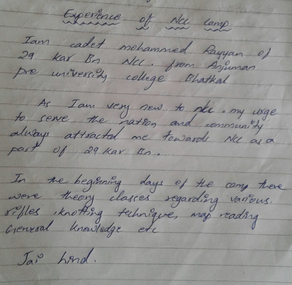 Name-md Rayyan, Rank-cdt, Regt no -KA19SD553698,school-Anjuman pre university college bhatkal, Unit -29KAR NCC, GPHQ-BELGAVI,Dte-Karnataka & Goa