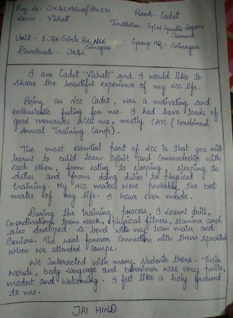 I cadet Vishali Reg. No. JK19SWA/180371. Here for sharing of my experience of NCC.