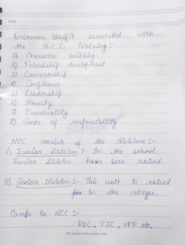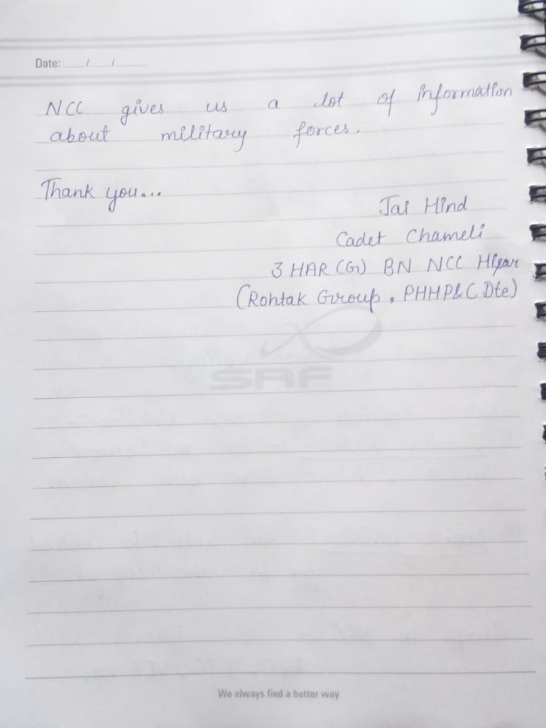 Jai Hind! I am Cadet Chameli from 3HAR(G)Bn NCC Hisar of the Rohtak Gp. Of PHHP&C DTE. I want to tell about NCC. NCC is a very important part of every Cadet's life. Please read it.