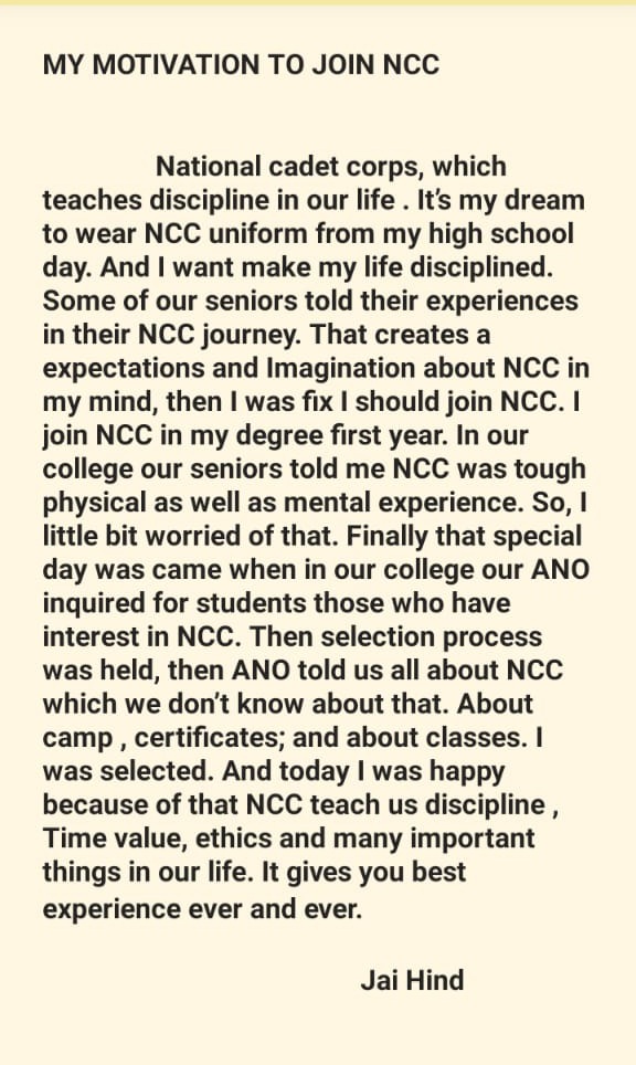 Name - Cdt. Triveni .M. Gond, Reg.no.- KA19SWA553045, college - DR.A.V.Baliga college of arts and science kumta, Unit - 4/29 KAR BN NCC, Karwar, Group HQ - Belagavi, Karnataka- Goa directorate