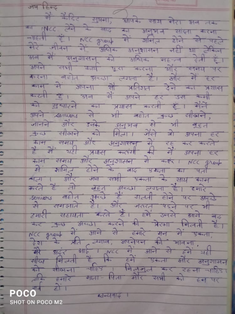 जय हिंद मैं कैडेट सुषमा 3HAR (G) BN NCC, Hisar से आज आप सभी को मेरा अब तक का अनुभव बताना चाहती हूँ|