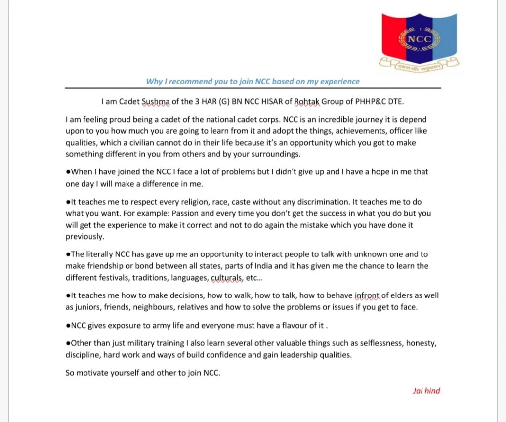 I, Cadet Sushma (HAR/20/SWA/257186), of 3 HAR (G) BN NCC HISAR (Rohtak Group, PHHP&C DTE). I am hear to share my views on why i recommend you to join NCC based on my experience.