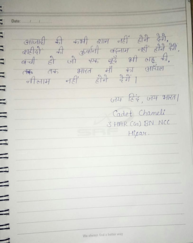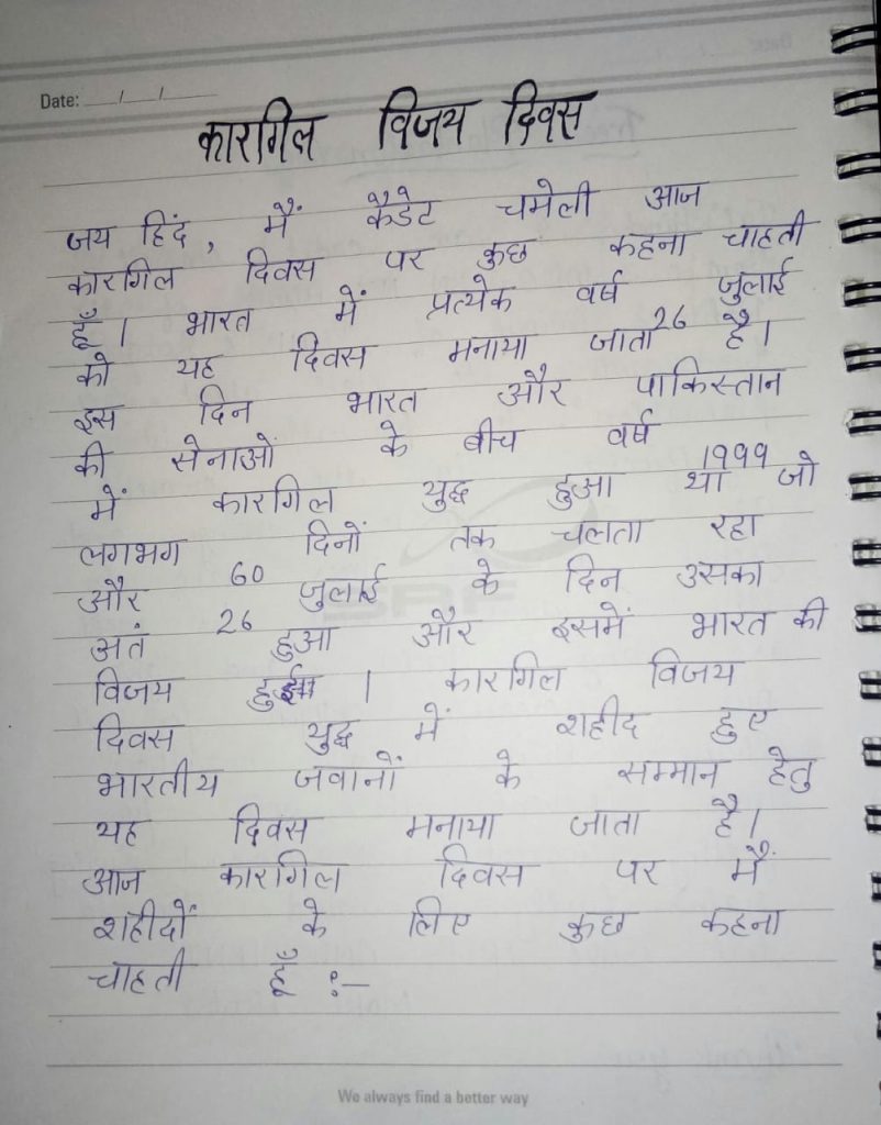 Jai Hind! I am Cadet Chameli from 3HAR(G)BN NCC Hisar of the Rohtak Gp. Of PHHP&C DTE. I want to tell about kargil day. Please read it.