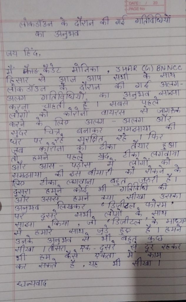 जय हिंद, मैं कैडेट मोनिका,आज लोक डाउन के दौरान की गई गतिविधियों का अनुभव सांझा करना चाहती हूँ|