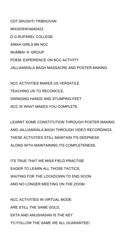 I am CDT. Srushti tribhuvan . So I am going to share you my NCC experience through poem