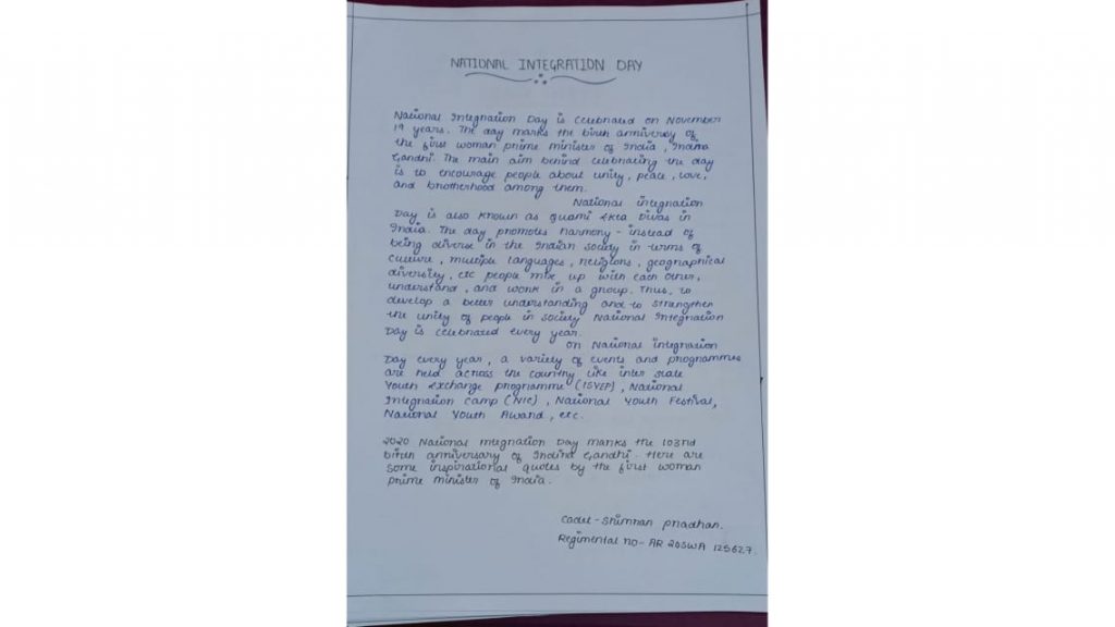 National integration day is celebrated on Nov 19 every year .The day marks the birth anniversary of the first woman prime minister of India,indhira Gandhi .The main aim behind celebrating the day is to encourage people about unity,peace love among th