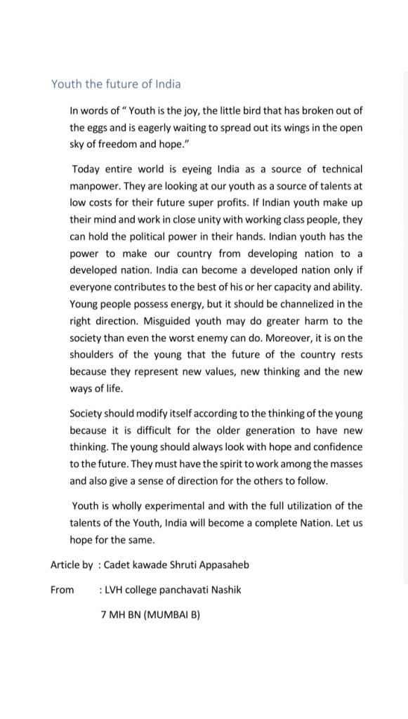 Name : Cadet kawade Shruti Appasaheb from : Loknete Vyankatrao hirey college panchavati,Nashik. (FY BSc Student) Make your next generation qualified and modified. India's future is in their hand . Thank you so much !!