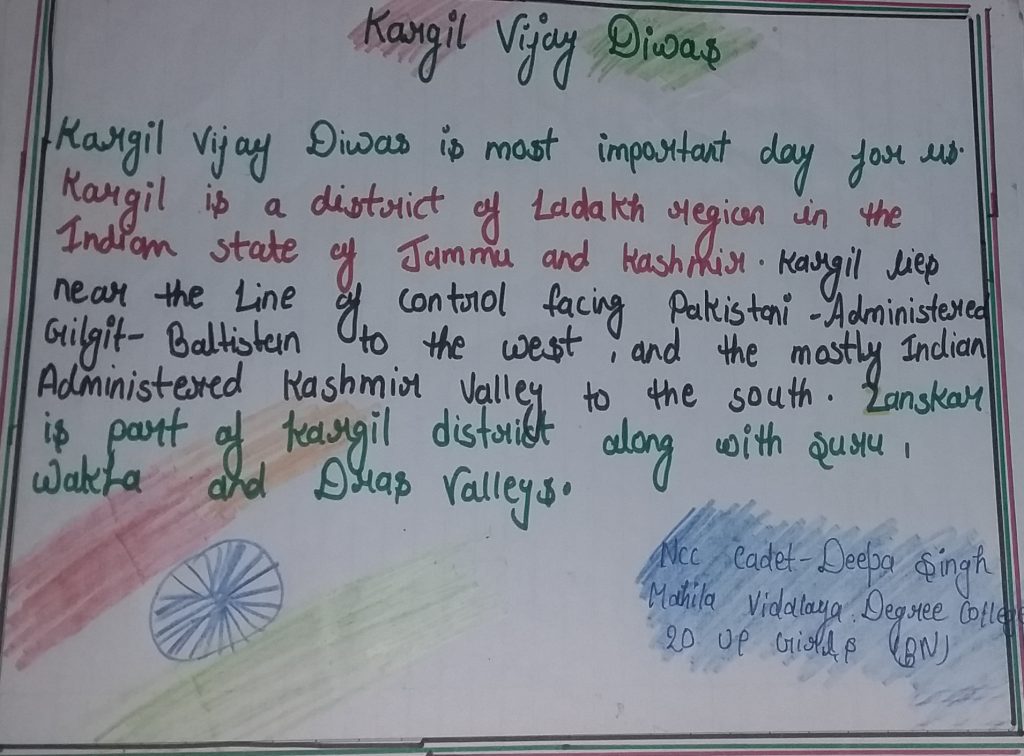 Name :- Cdt. Nishita Avinash Ghodinde Reg no :- MH20SWA645423 Activity :- Article writing Topic :- Kargil Vijay Diwas Ghanshyamdas saraf college, 8 MAH girls BN unit.