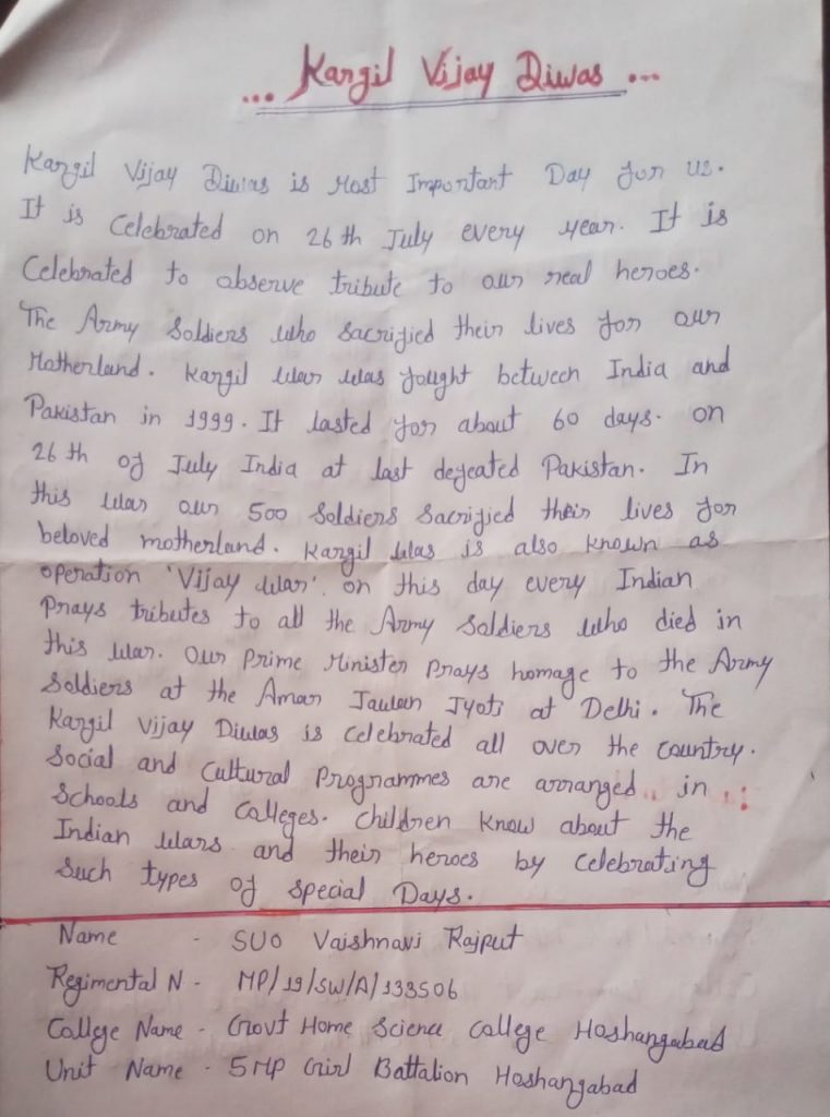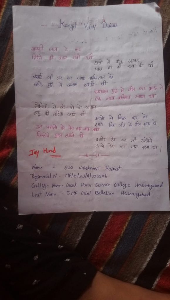 I'm SUO Vaishnavi Rajput I'm from 5mp girl battalion Hoshangabad