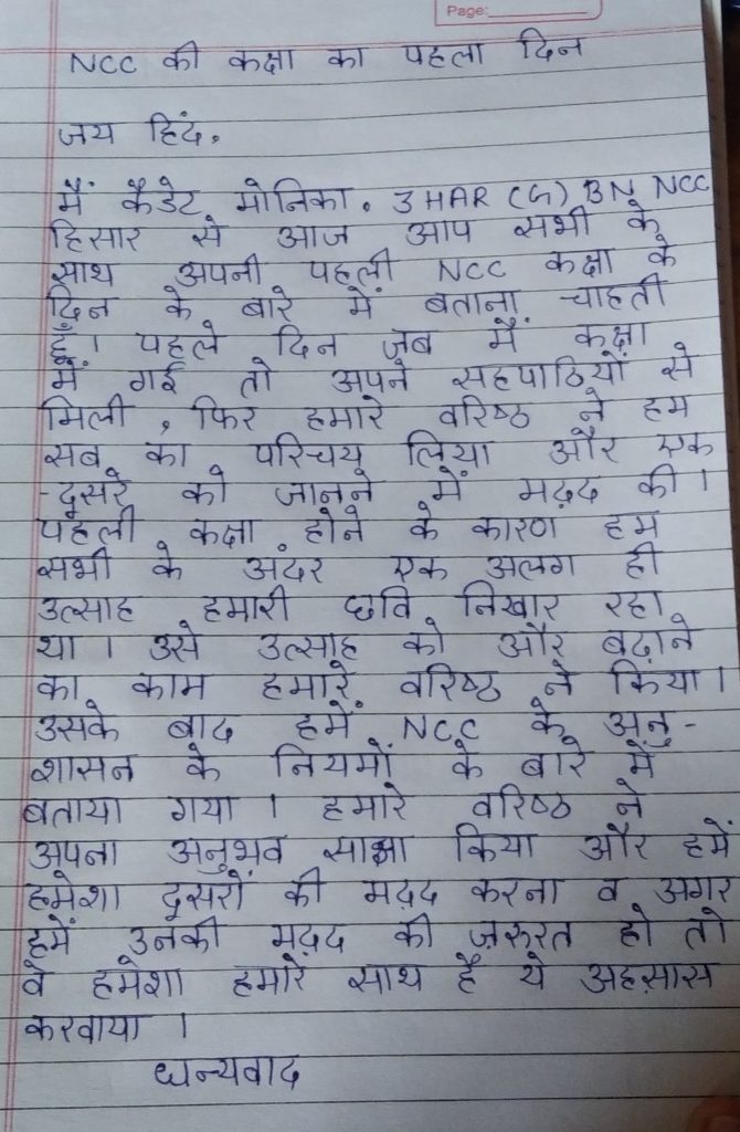 जय हिंद मैं कैडेट मोनिका 3HAR (G) BN NCC, Hisar से आज आप सभी को पहली NCC कक्षा के बारे में बताना चाहती हूँ|