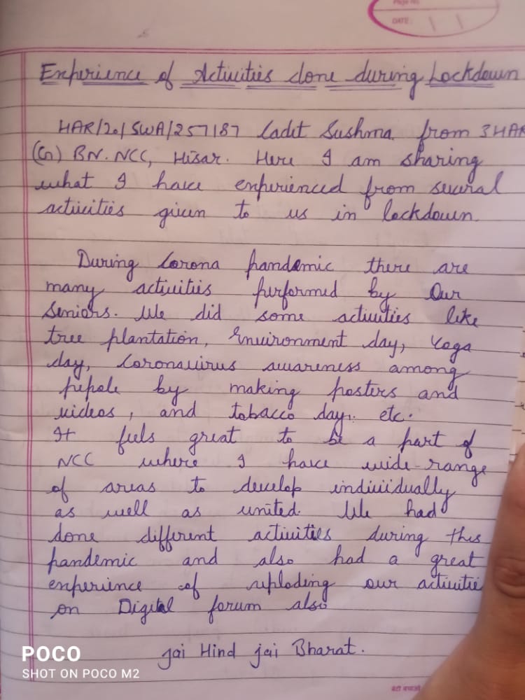 Jai hind HAR/20/SWA/257187 Cadet Sushma from 3 HAR (G) BN NCC, HISAR. Today I will sharing with you my experience during this pandemic.