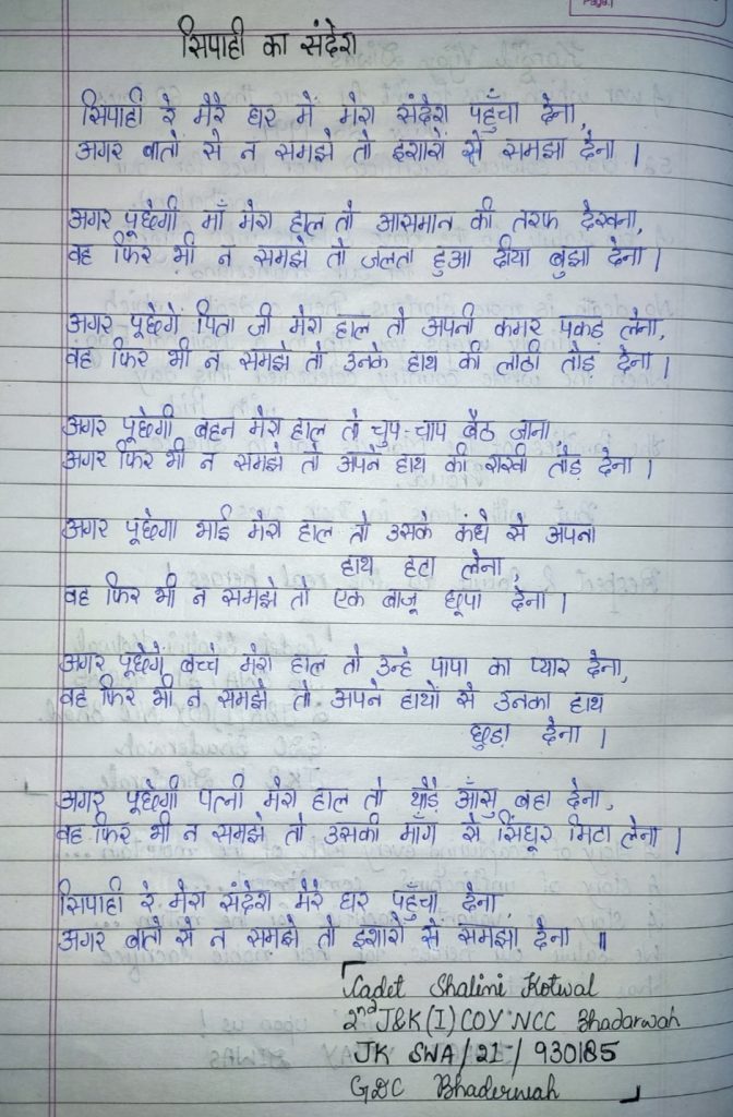 Cdt. Shalini kotwal JK SWA/21/930185 2nd J&K (I) COY NCC GDC bhaderwah