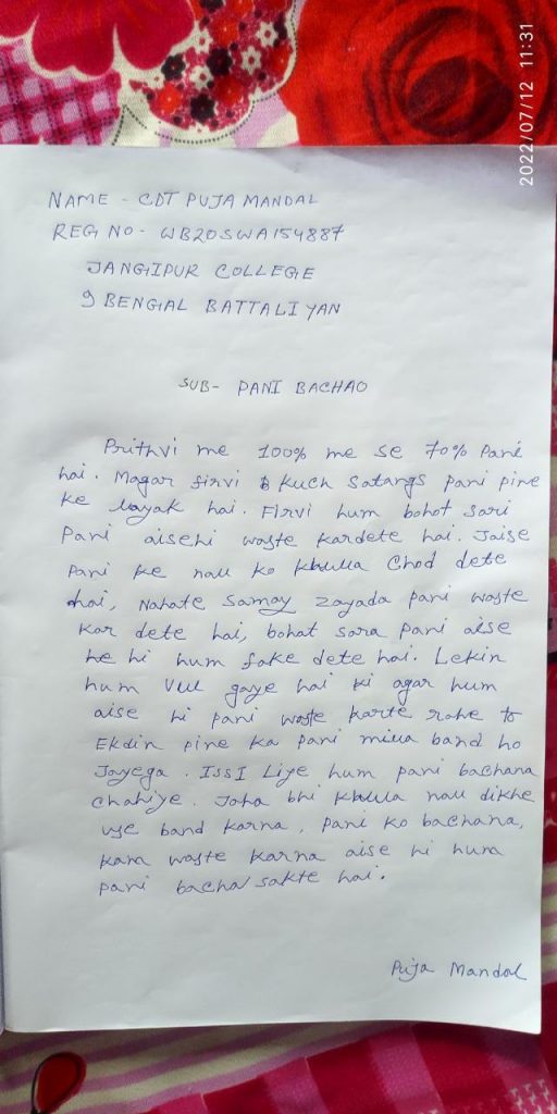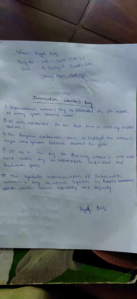 NAME -- CDT PUJA MONDAL COLLEGE NAME-- JANGIPUR COLLEGE UNIT-- 9 BENGAL BN NCC GROUP-- KALYNI GP DTE- WB &SIKKIM DTE