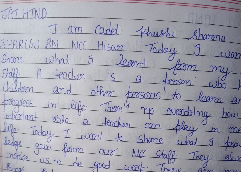 JAI HIND I am cadet khushi sharma of 3 HAR (G) BN NCC Hisar. Here I want to share what I knowledge gain from our NCC staff.
