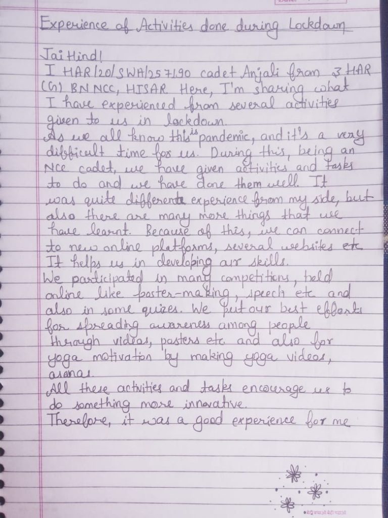 Jai Hind! I HAR/20/SWA/257190 cadet Anjali from 3 HAR (G) BN NCC, HISAR. Here I'm sharing through an article what I have experienced from the activities and tasks done during lockdown.