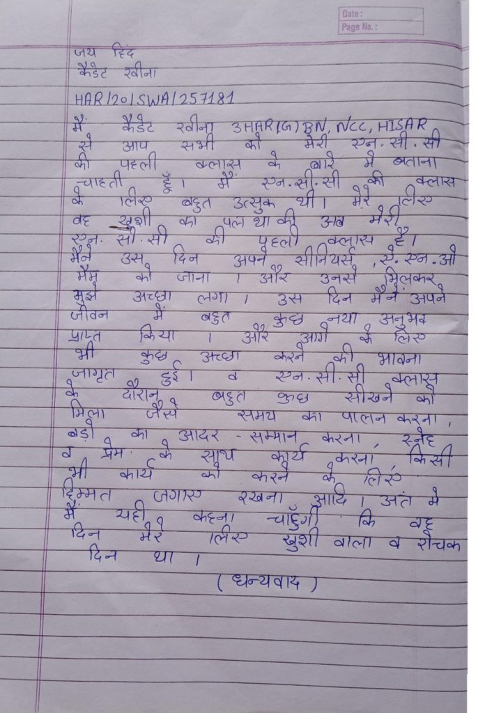 जय हिंद कैडेट- रवीना HAR/20/ SWA/257181 मैं आज यहां एनसीसी की पहली क्लास का अनुभव सांझा कर रही हूँ !