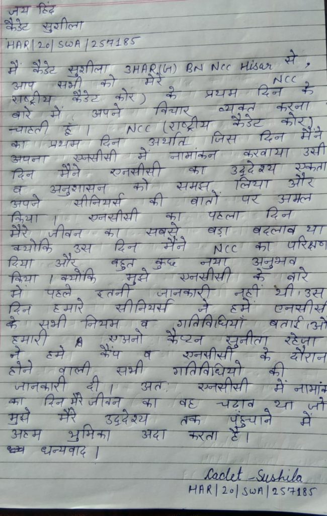 जय हिंद कैडेट सुशीला आज मैं आप सभी को अपने एनसीसी के पहले दिन के बारे में बताना चाहती हूं।