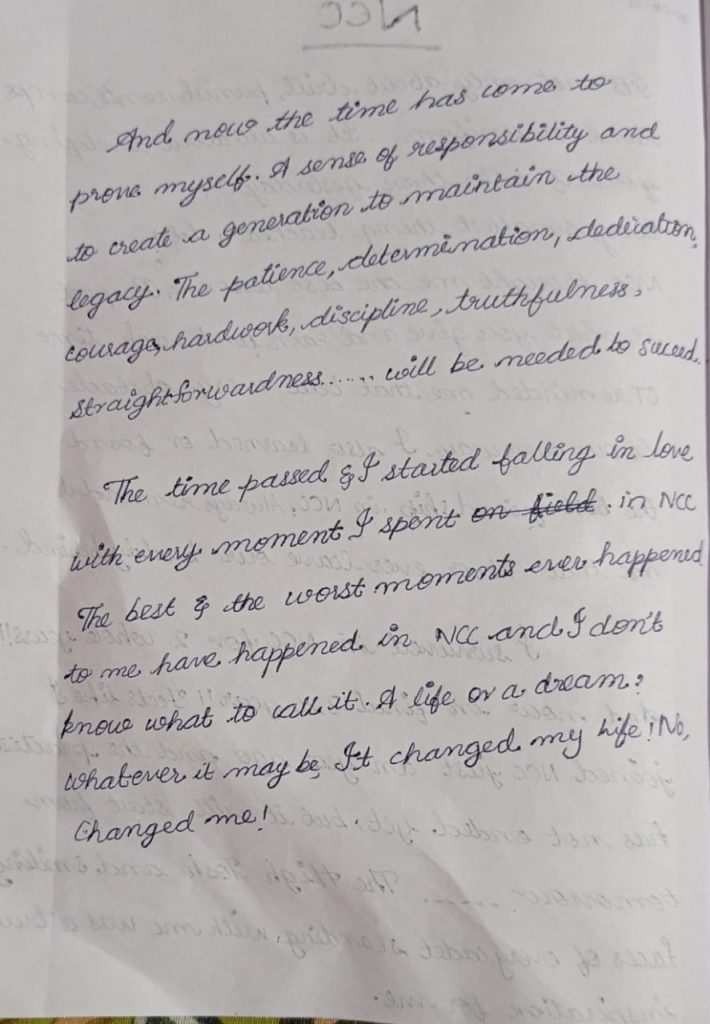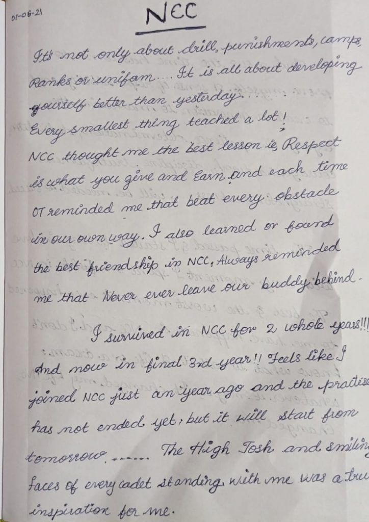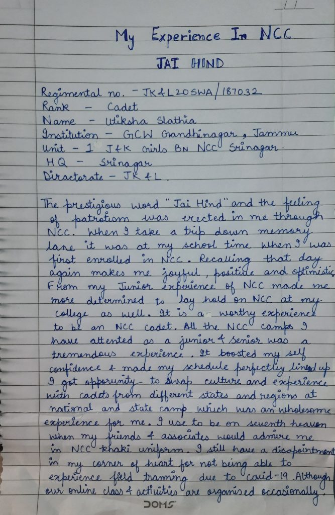 I cadet utiksha slathia from GCW Ghandhinagar, Jammu . 1J&K girls BN NCC Srinagar. I showcase my article i.e my experience in ncc as being a cadet from school days to college life.