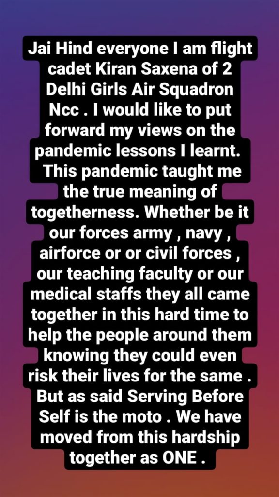 I am Flt Cdt Kiran Saxena of 2 DELHI GIRLS AIR SQUADRON NCC . regimental no. DL20SWF850352