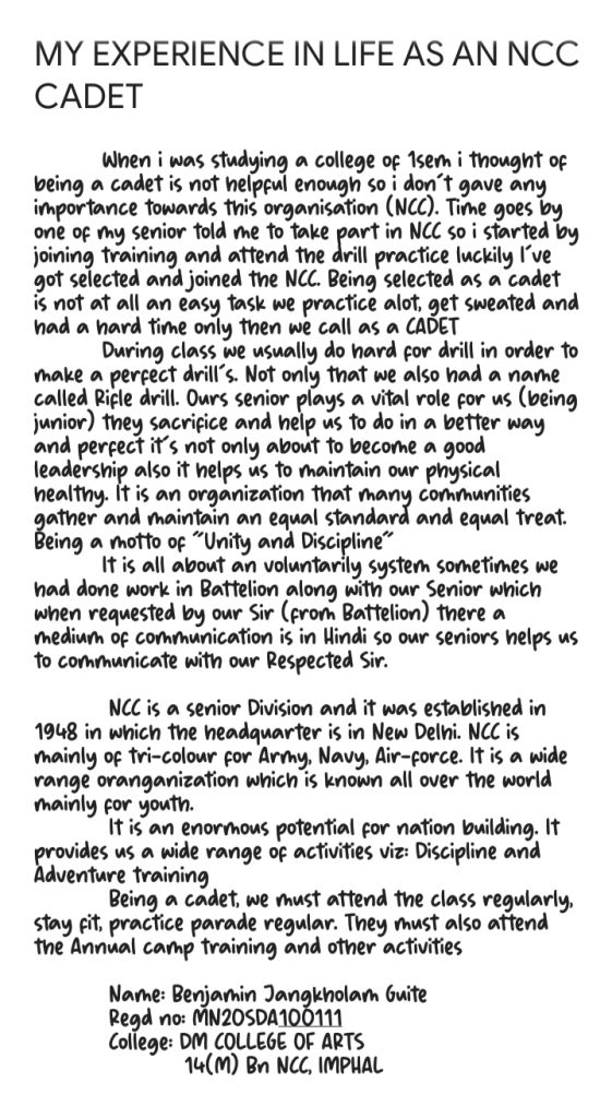 I am lfc gayatri my reg. No. is HP19SWF309234 . I studied in bsc maths third year..I am also NCC cadet.In NCC we have done many activities such as mountain climbing, parades,cleanliss drives,rallies,blood donation.