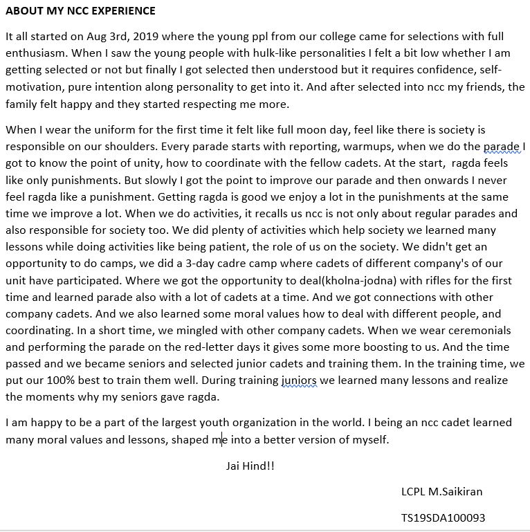 LCPL M.Saikiran TS19SDA100093 2(T) Bn NCC COY 11/2 ,SEC-BAD GRP