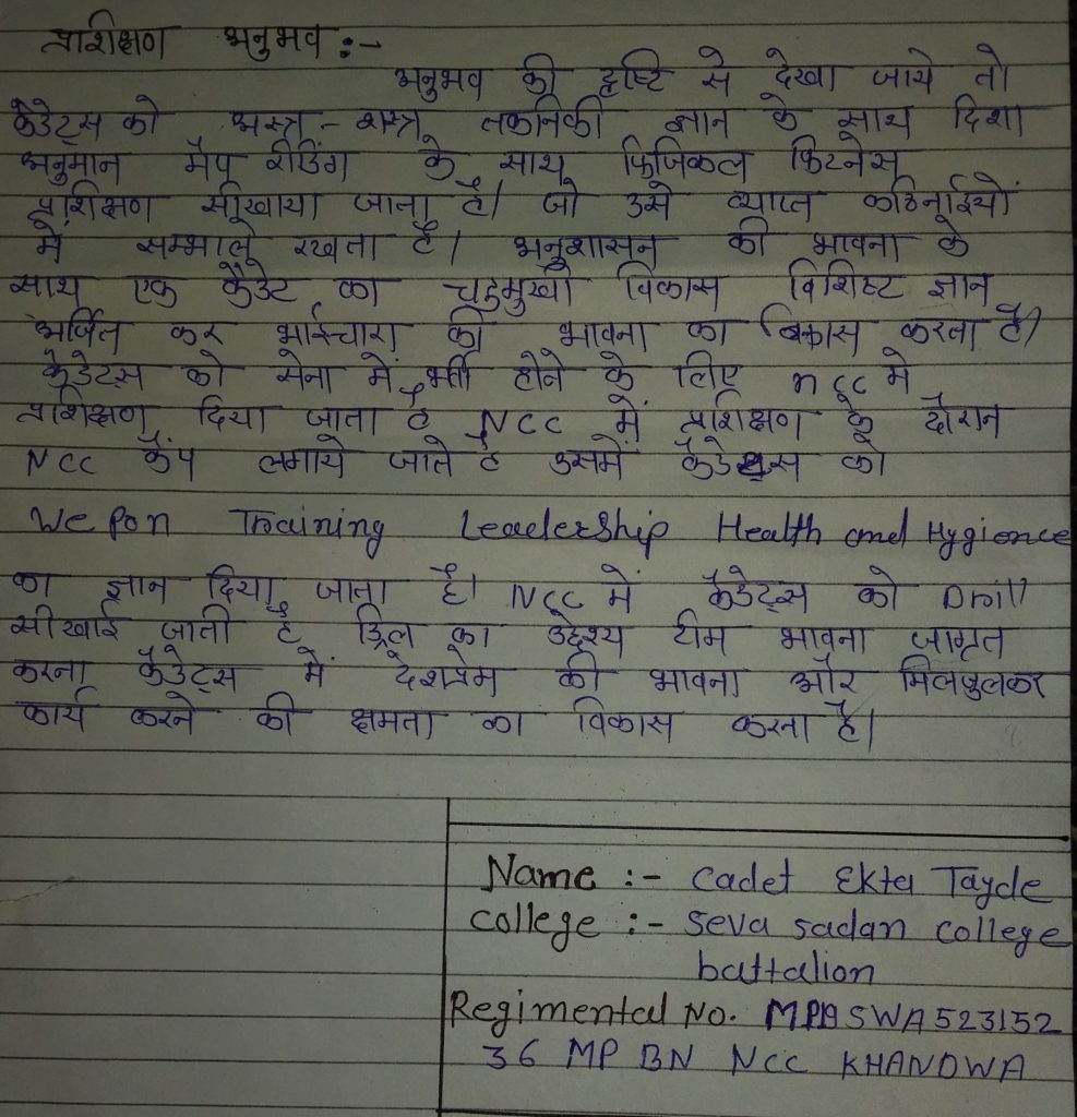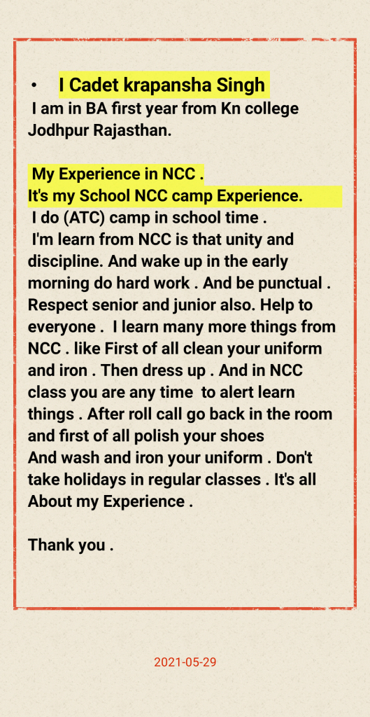 I'm Bhawana narnoliya from unit 1 raj r&v sqn ncc bikaner. Cdt no. RJ/19/SW/470021.