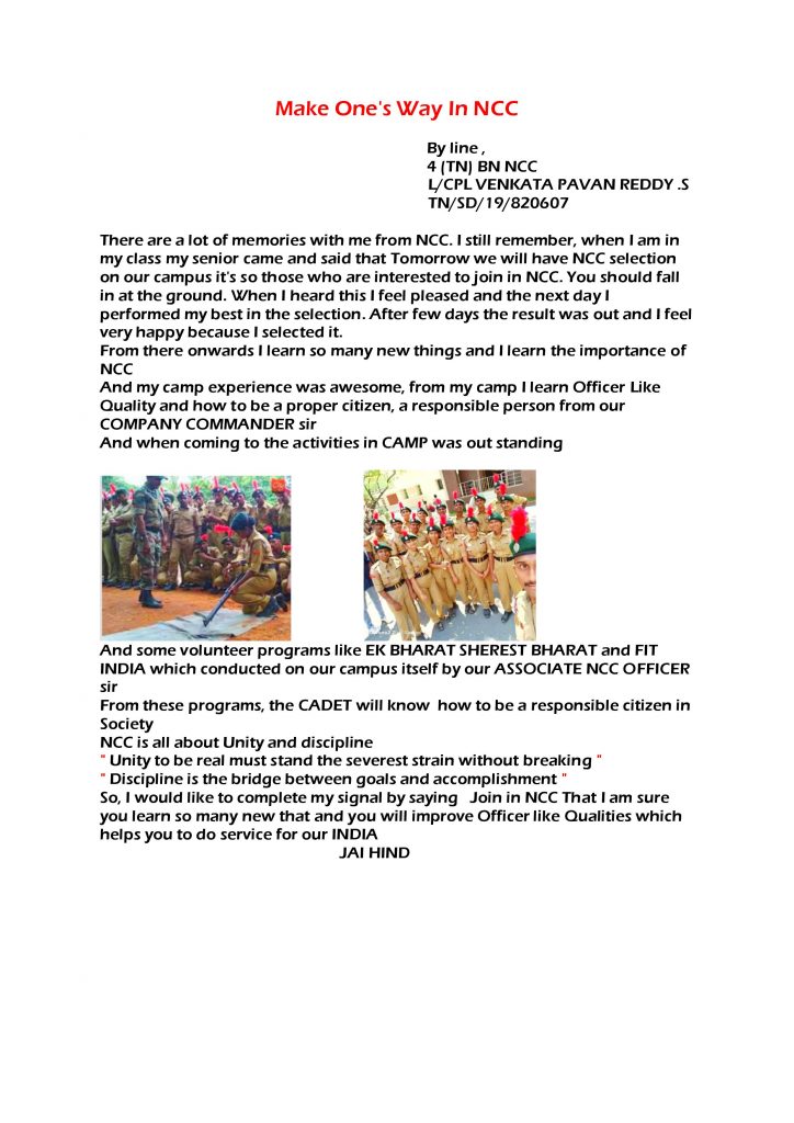 L/CPL VENKATA PAVAN REDDY.S from 4(TN) BN NCC, Coimbatore, Tamil Nadu