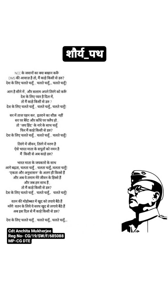 I am cadet Anchita Mukherjee from 3CG Air Sqn Ncc Unit,MP-CG DTE,Regno-CG/19/SW/F/685088. I had recently appeared for B certificate Exam. I came first in EBSB online camp 2020 group song competition. Now,I m preparing to appear in AIVSC and RDC 2020