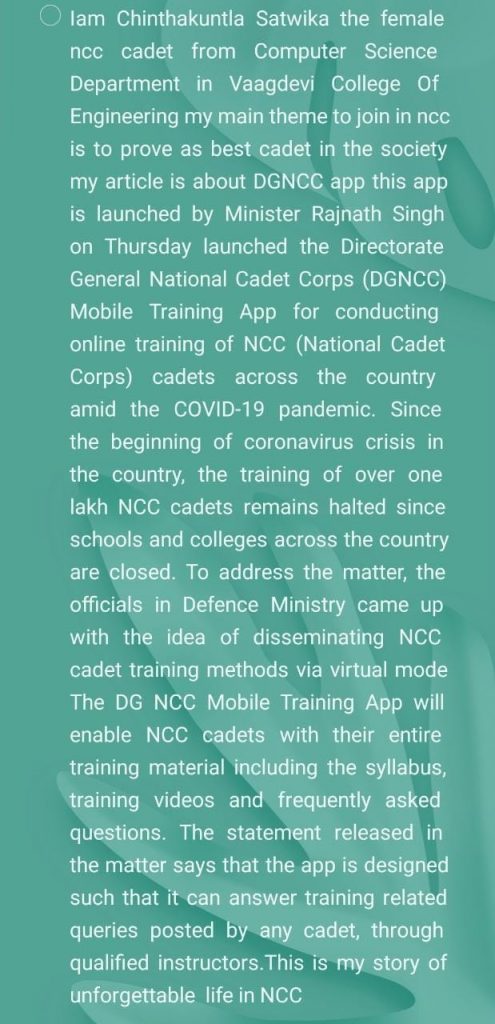 cadet.Ragini katoch Cadet no.HP19SWA280433 S.C.V.B. GC.palampur 1HPboys bn. Ncc solan