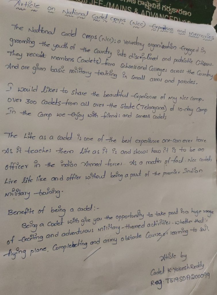 Cadet K. Yokeshreddy Reg:TS19SDA200099 1(T)CTR UNIT WARANGAL GROUP