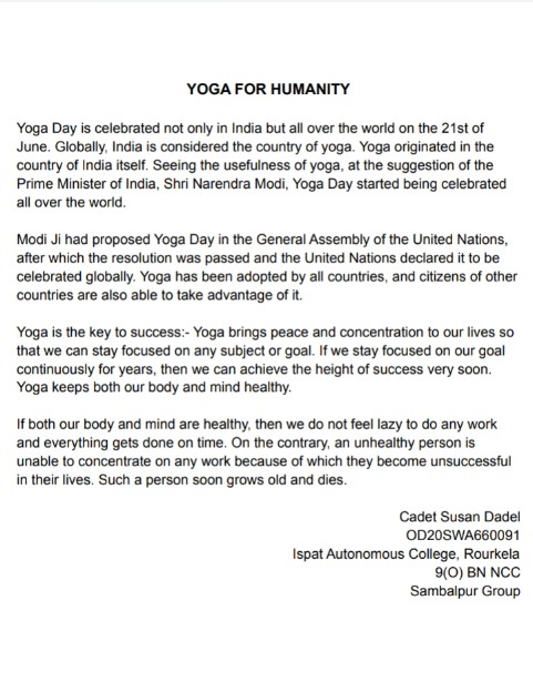 Cadet Susan Dadel OD20SWA660091 Ispat Autonomous College, Rourkela 9(O) BN NCC Sambalpur Group