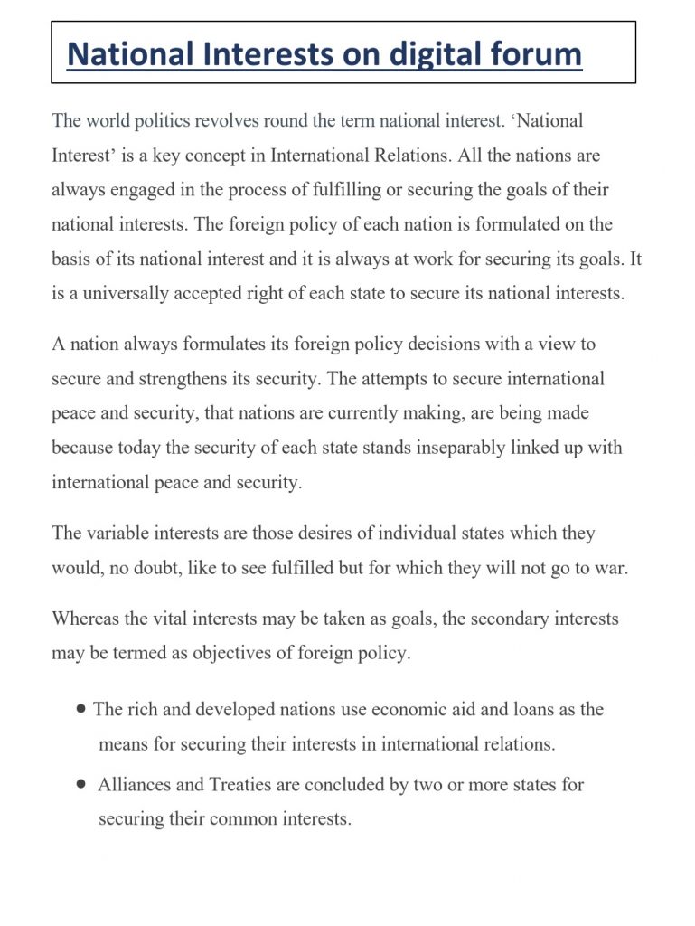 National Interest is one of the important concepts for a country in International Relations. As a whole, it is defined as “survival and security of a state”.