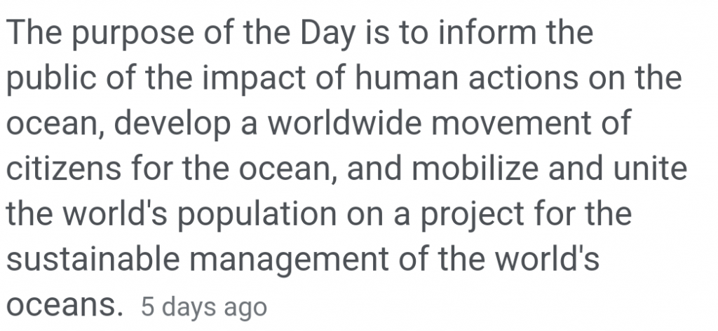 World ocean day is celebrated to protect the ocean from getting destroyed..