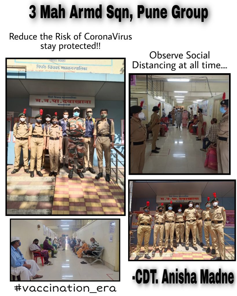 Unit: Pune Group, 3 Mah Armd Sqn CDT. Anisha Madne (MH/19/SW/962041) Glimpses of Covid-19 Vaccination Drive Camp... Volunteering & Maintaining social distancing...