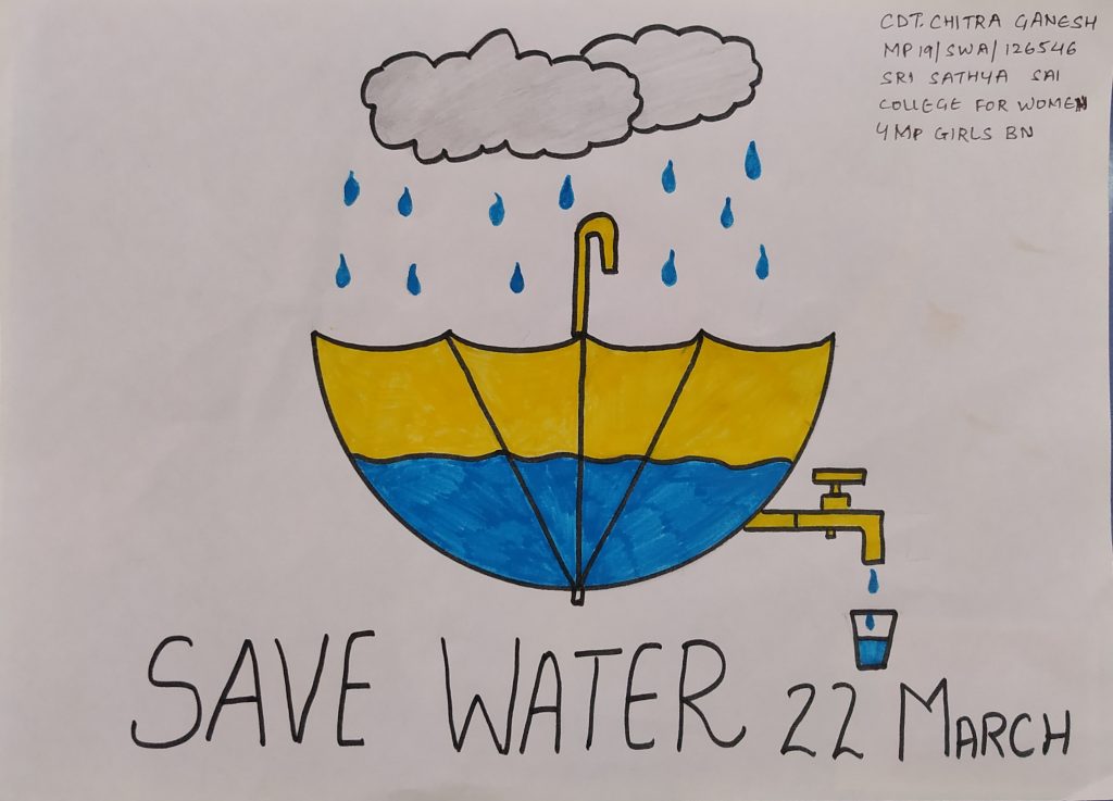 Jai hind. I am Cdt. Chitra Ganesh of Sri Sathya Sai college for women bhopal grp. I had made poster on world water day. Save water!!