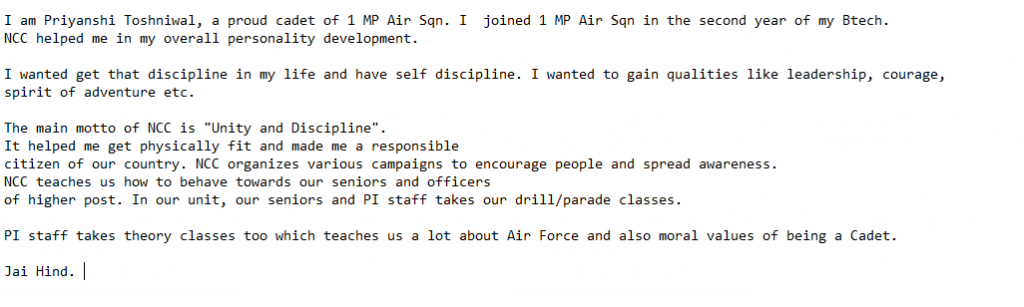 I am cadet priyanshi Toshniwal and i am glad i joined ncc air wing, it helped me boost my confidence and my motivation.