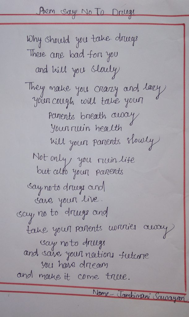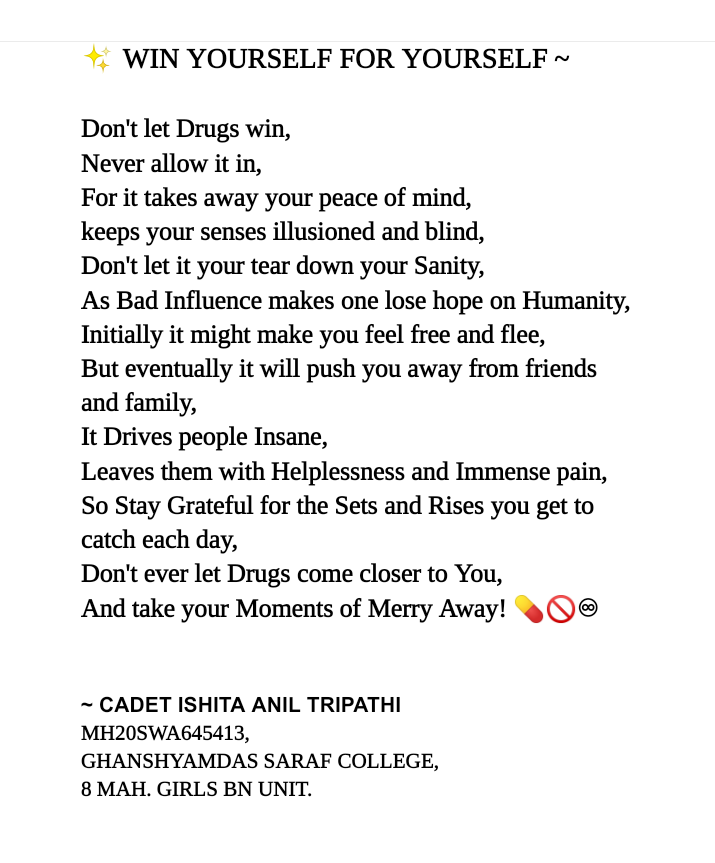 Jai hind. I am Cdt Chitra Ganesh of Sri Sathya Sai college for women bhopal grp. I had made poster on the occassion International Day against Drug and illicit trafficking.
