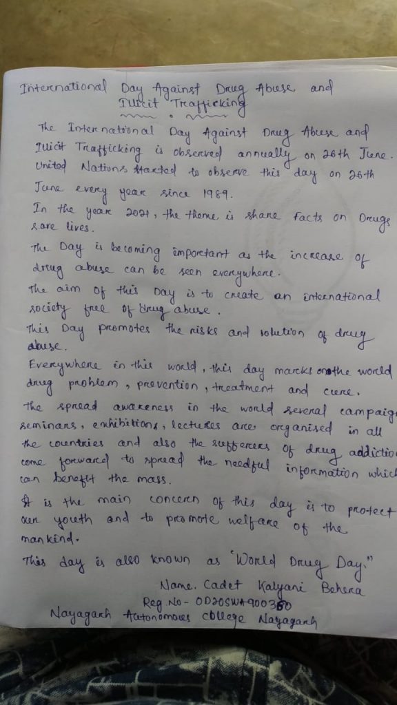 My name is cadet.kalyani behera OD 20SWA900360 of NCC bn 1 odisha. My college name is nayagarh autonomous college, nayagarh, odisha