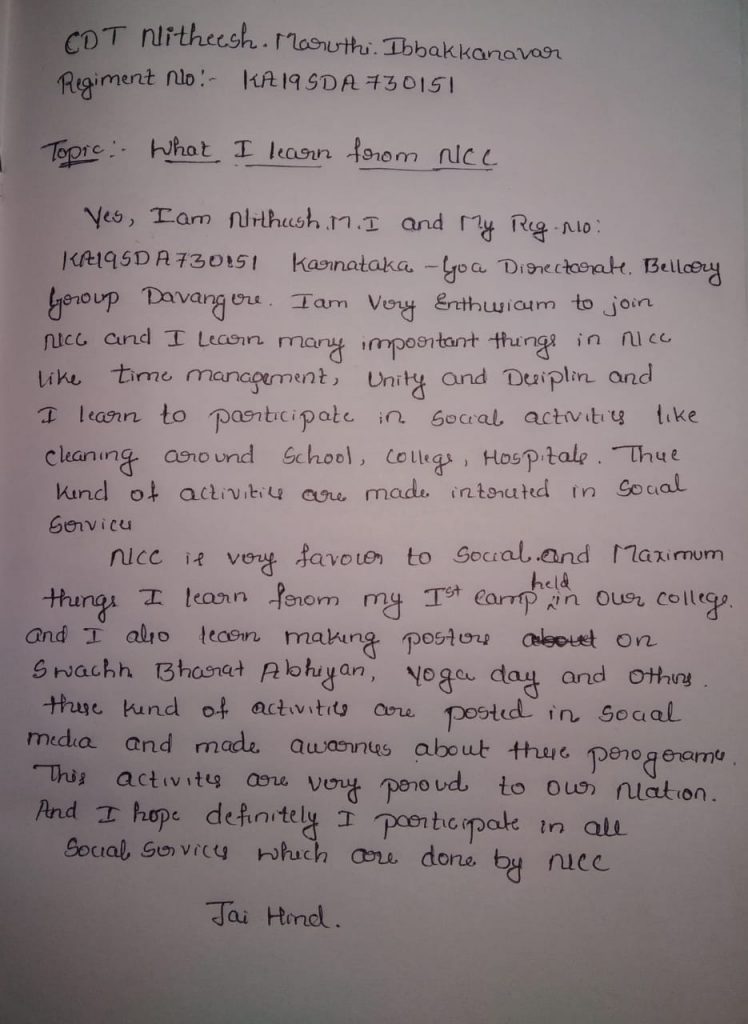 CDT NITHEESH MARUTI IBBAKKANAVAR REG NO: KA19SDA730151 3KAR ENGR COY NCC BALLARY GROUP KARNATAKA AND GOA DIRECTORATE