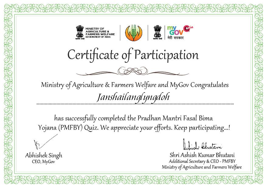 Pradhan mantri Fasal Bima Yojana (PMFBY) Quiz. Certificate of Participation