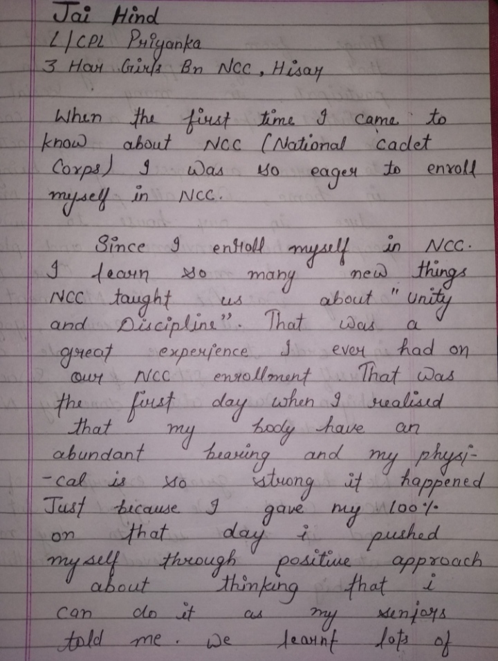 I L/CPL Priyanka from 3Har Girls Bn NCC, Hisar is sharing my views and experience about the NCC that how NCC changed my life .The life before taking NCC was so simple and after getting enrolled in NCC i learnt alot of things
