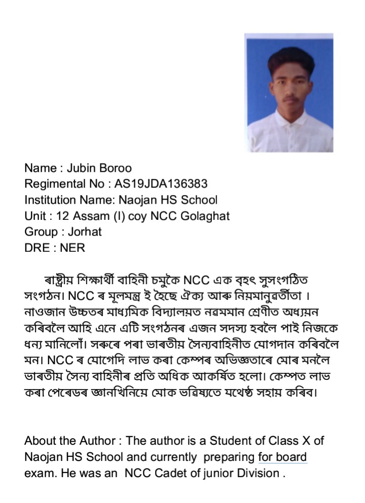 Jubin Boroo is a Student of Class X of Naojan HS School located golaghat district of Assam