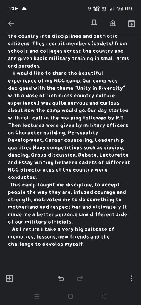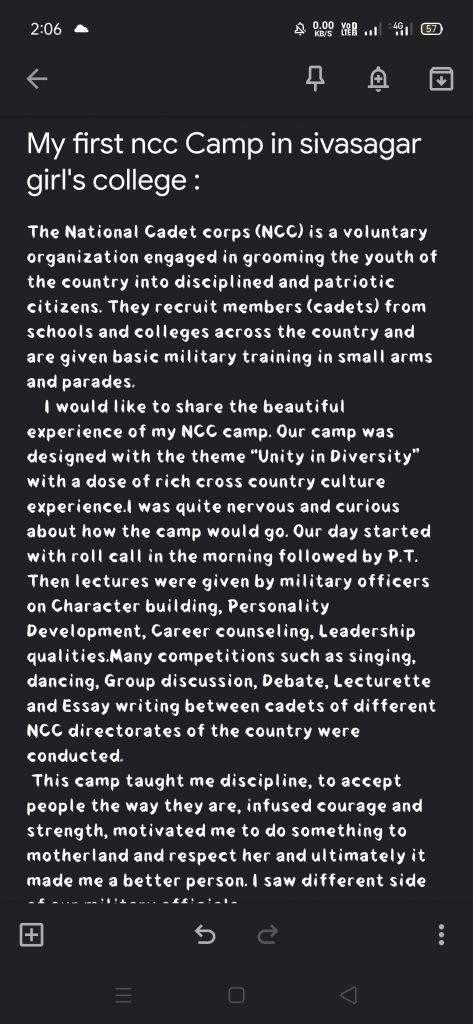 Name :Afruja Begum college : swahid peoli phukan college Unit : 11 Assam girls ( I) coy ncc. Regimantel no : AS19SWA128533