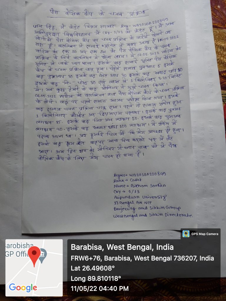 I cadet Bikram Sarkar Reg No- WB20SDA220849 Coy- 2/13 Alipurduar Universiy 13 Bengal BN NCC