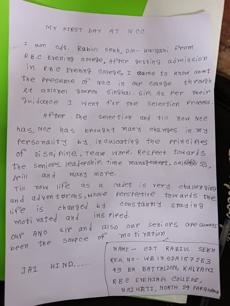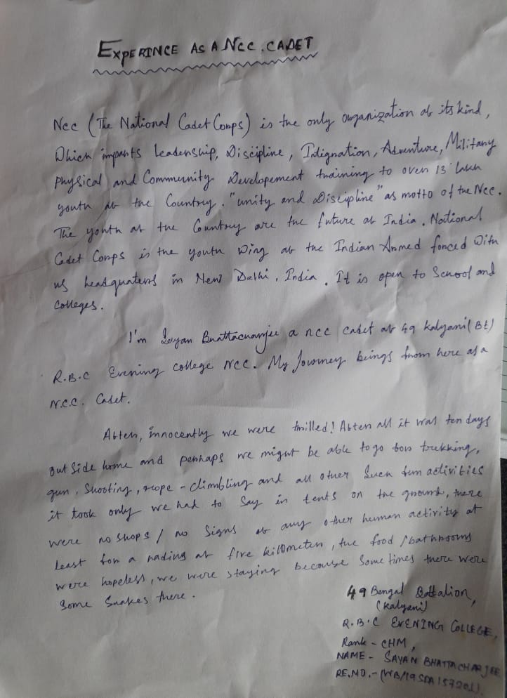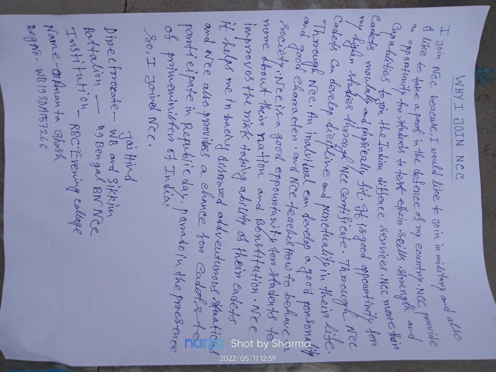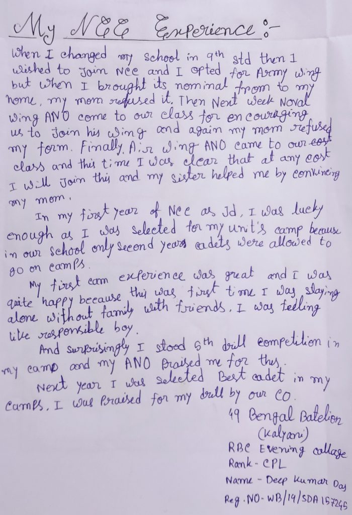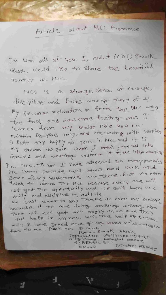Hi.I am cadet souvik ghodh of 49 Bengal BN of ncc. RegtlNo-WB/19/SDA/157465.