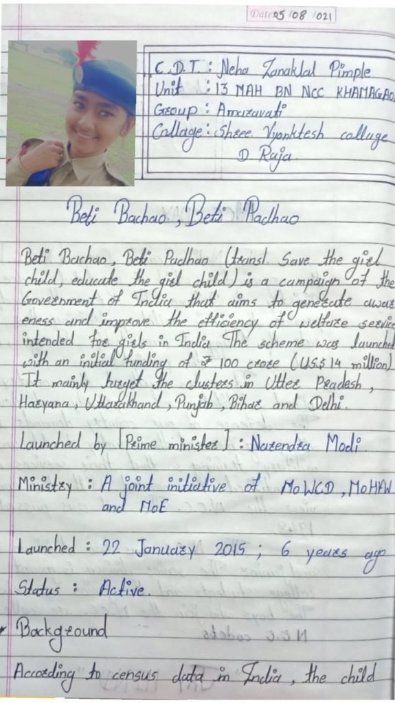 Cadet Neha Zanaklal Pimple from S V College deulgaon raja.