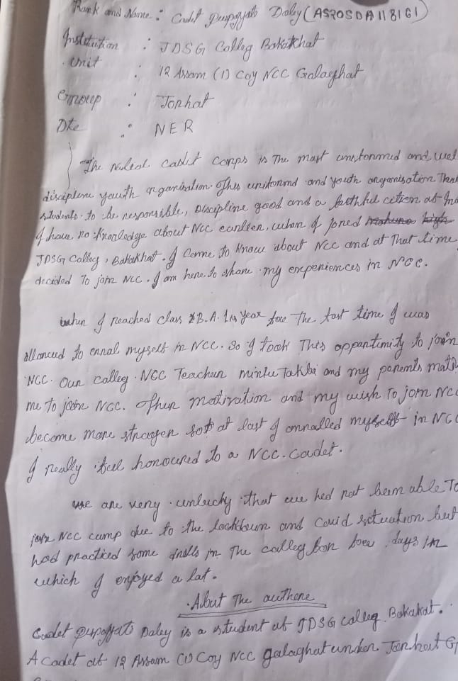I'm aramita roy. I'm from dhupguri sukanta Mahavidyalaya. Regiment no:WB/20/SWA/224687 Rank : cadet