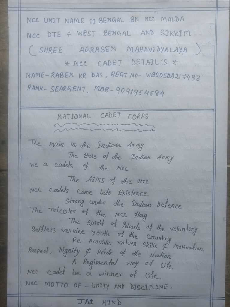 SHREE AGRASEN MAHAVIDYALAYA NCC UNIT NCC CADETS DETAILS:- NAME:- RABEN KR DAS, REGIMENTAL NO :- WB20SDA217483, RANK:- SEARGENT, NCC UNIT NAME:- 11 BENGAL BN NCC MALDA, NCC DTE:- WEST BENGAL AND SIKKIM
